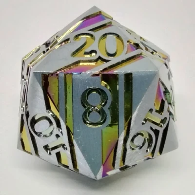 Gros d20 en métal (33mm): argent avec stries arc-en-ciel